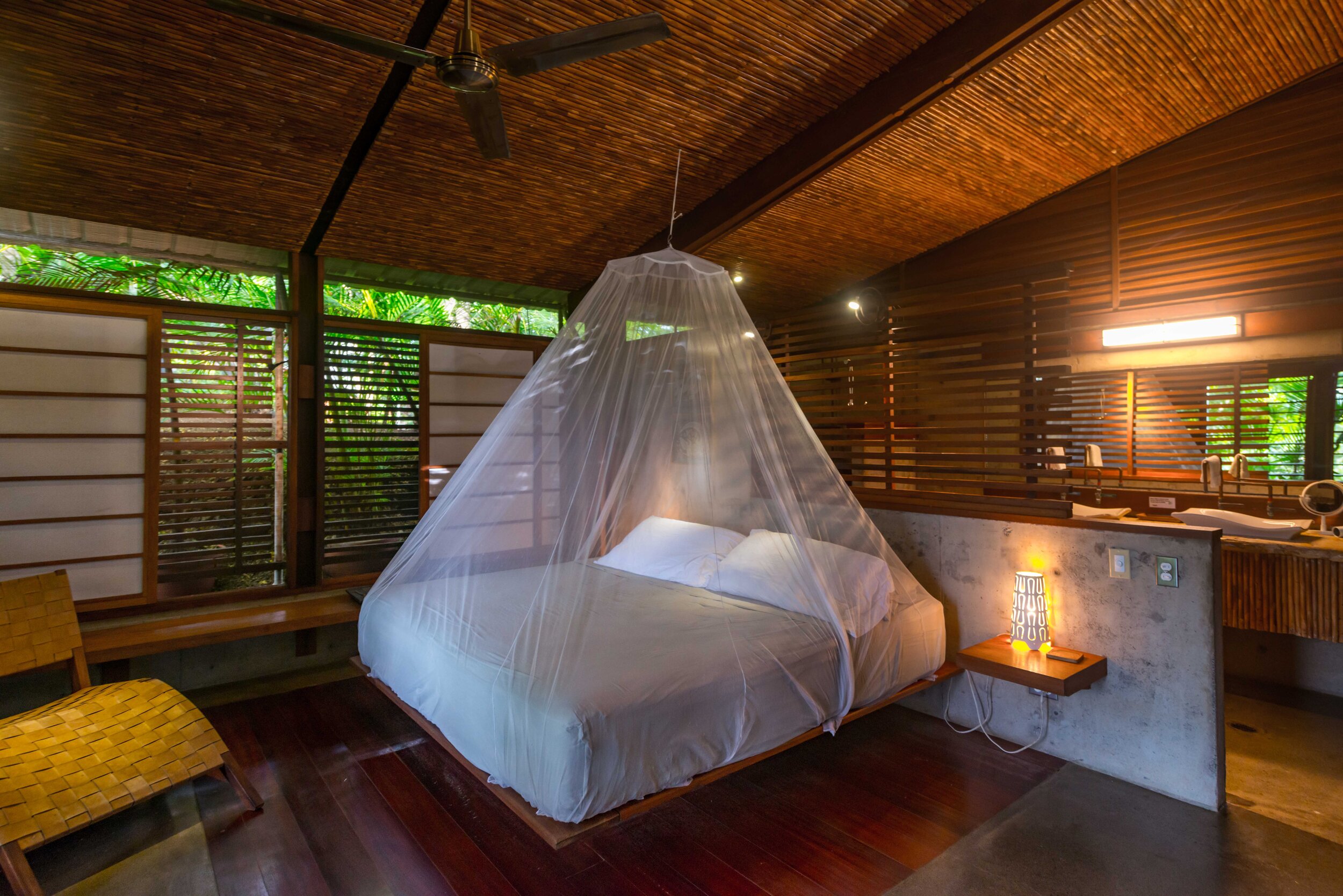 This home's position on a ridge overlooking the jungle canopy allows cool breezes to flow through it, and polished concrete floors keep the house cool, even in the heat of the day. Asian inspired 12' sliding privacy walls open both master bedrooms to the home, and ceilings fans provide comfort for your sleeping ease. En-suite open air bath with double vanities feature beautiful copper hand made detail. An open concept kitchen awaits your culinary expertise with stainless steel appliances, fridge, 4 burner gas stove top, oven and it is fully stocked with service for four, a selection of cookware, flatware, glassware, cooking utensils.